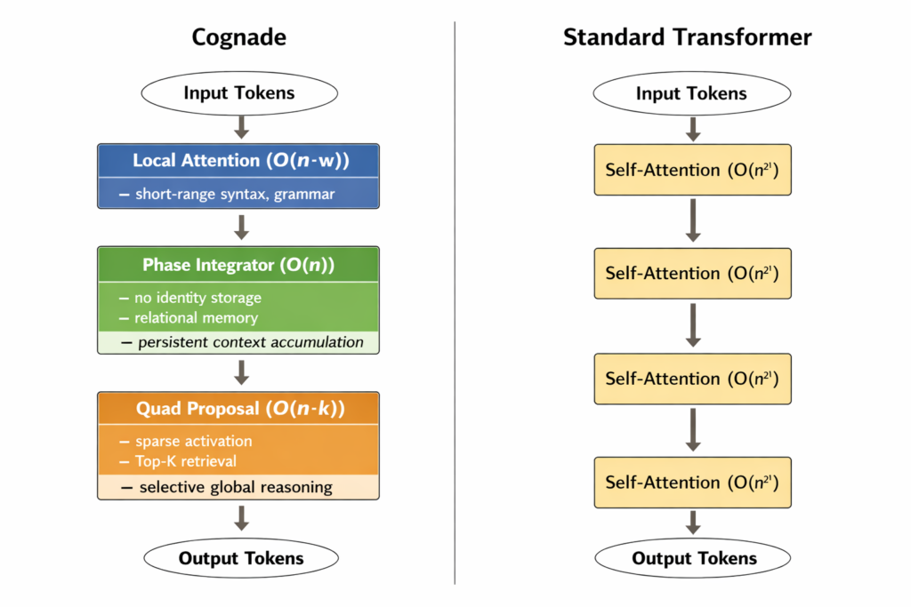 Cognade is an intelligent architecture designed for structured cognition—how memory, intent, and meaning evolve over time through phase-based accumulation, proposal-driven reasoning, and explicit semantic control, rather than relying solely on attention.